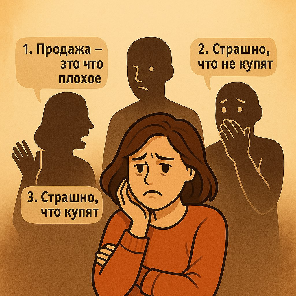 И у этого страха может быть несколько причин. Работала со своей клиенткой в терапии, у неё вот первым делом всплыла такая связка: купят → не смогу помочь, не будет результата → подумают, что я делаю деньи на людях → нельзя быть меркантильной.